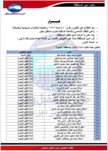 أصدر حزب مستقبل وطن عدة قرارات تنظيمية، حيث شملت إعلان تشكيل هيئة مكتب أمانة تنظيم المحافظة.